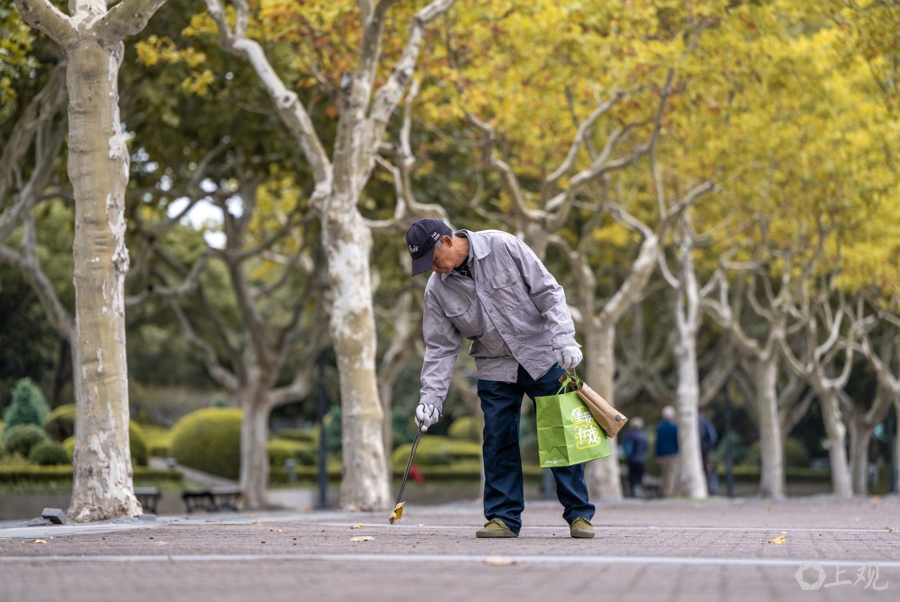 2025年10月24日,世纪公园内的千米梧桐大道上树叶渐染金黄,伴随着秋风徐徐飘落。落叶缤纷,工作人员老魏拿起拾叶夹,来回穿梭在公园金色浪漫中……