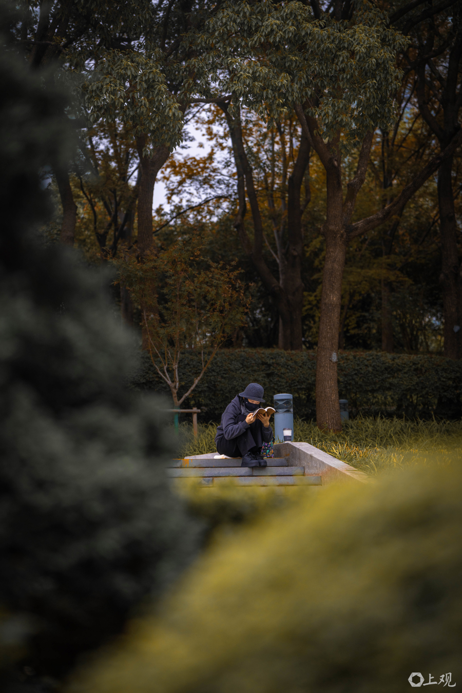 市民在世纪公园梧桐大道旁的台阶上阅读休闲。