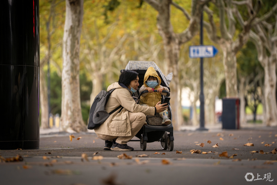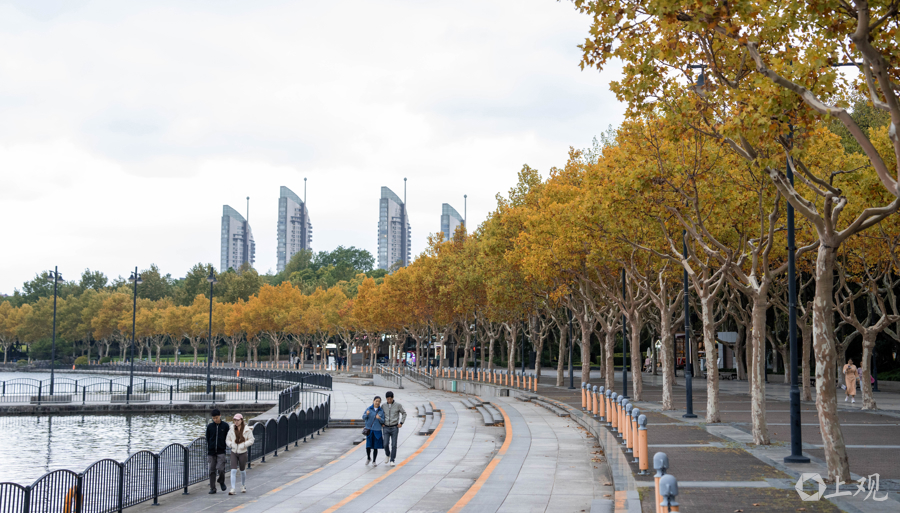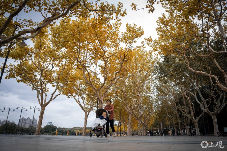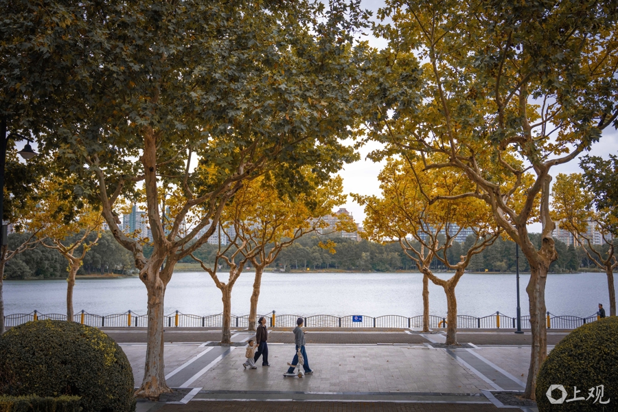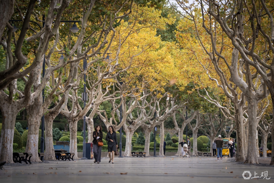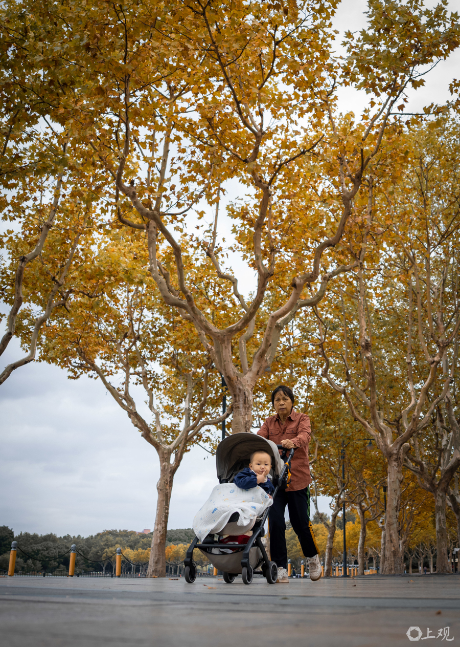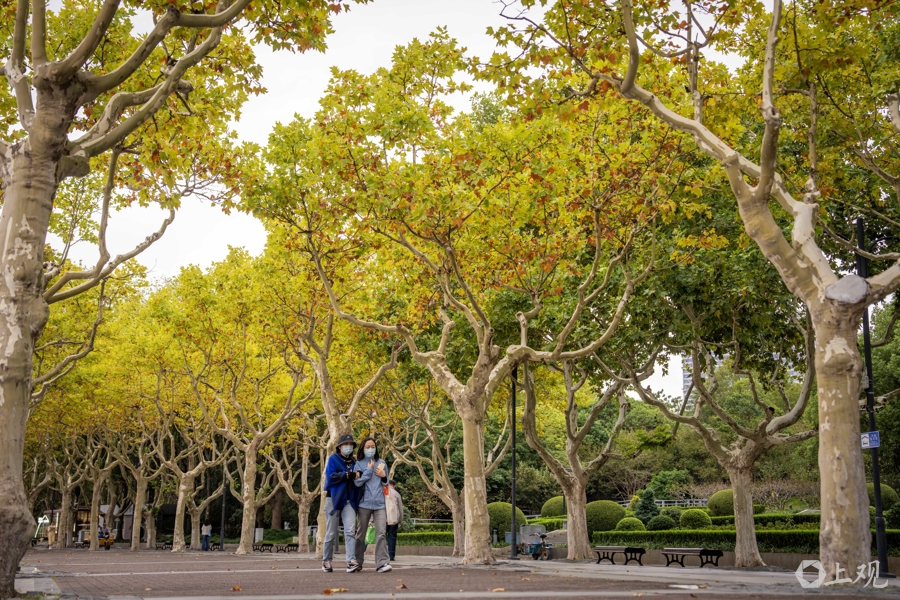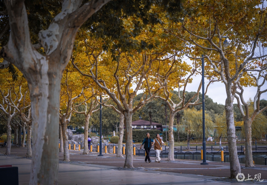 落叶缤纷,金色美景在园内上演,不少市民漫步园内,尽享秋日时光。