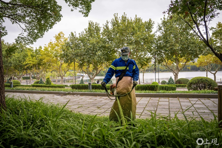 世纪公园工作人员对草坪进行秋日最后一次修剪。