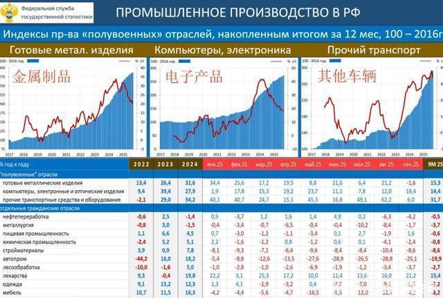 在数万亿卢布的国防预算支持下,坦克、装甲车、各种武器装备源源不断地生产,成了拉动经济增长的重要引擎。       但到了2025年,情况开始急转直下。       根据俄罗斯联邦统计局的数据,2025年9月,金属制品的产能竟然同比下降了1.6%。别小看这个数字,这可是自战争爆发以来,       第一次出现负增长!