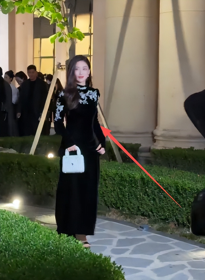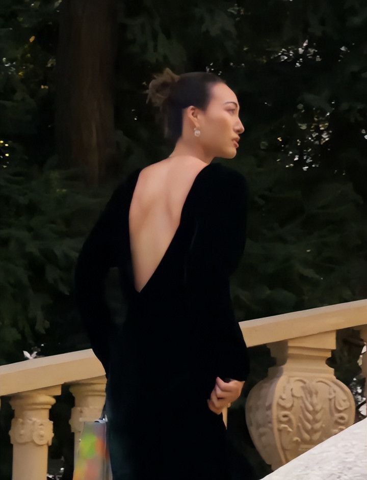 她选了条黑色无袖连衣裙,裙身用银色丝线绣出山水纹路,走动时像一幅流动的水墨画。